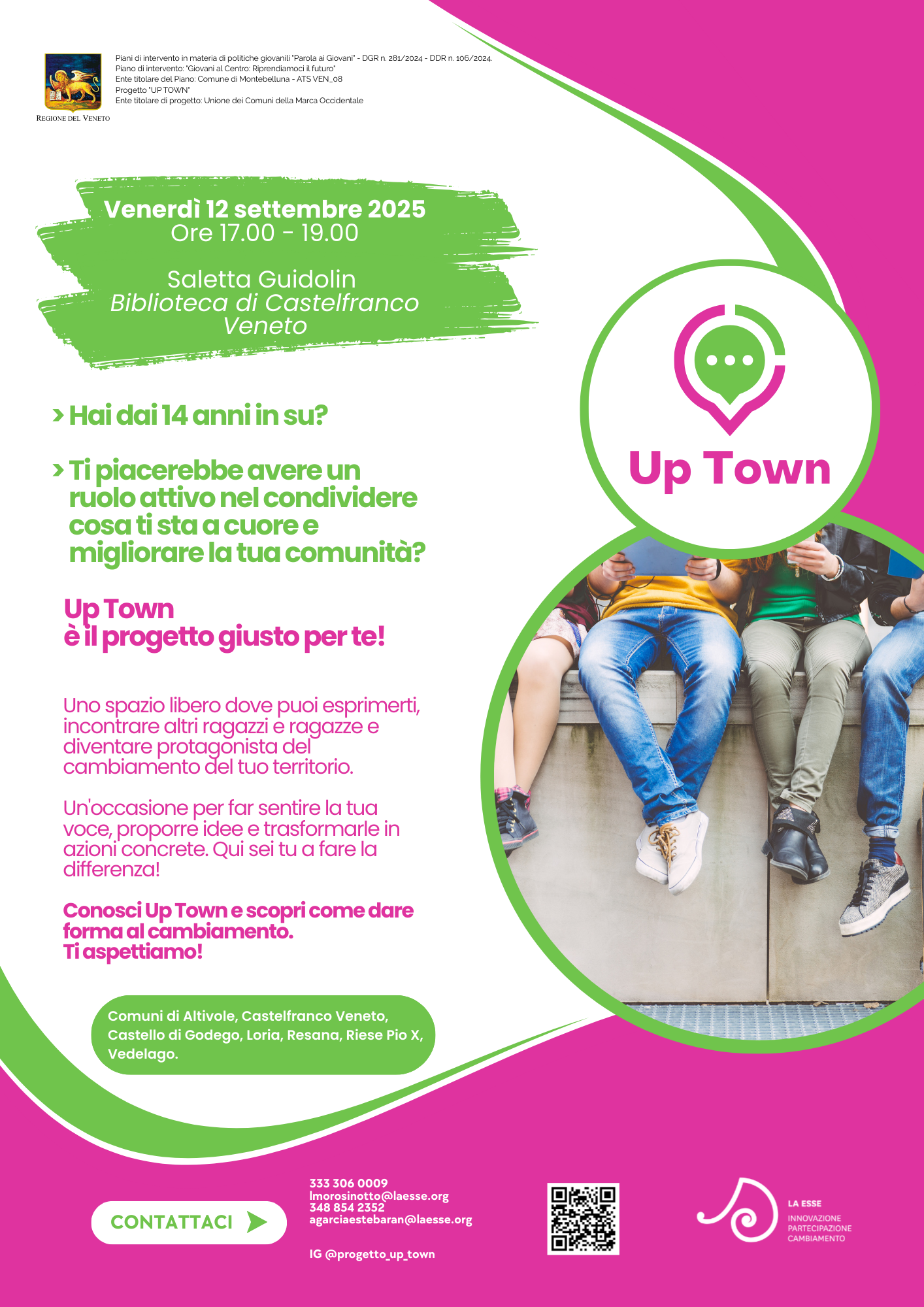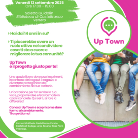 Il progetto Up Town è finanziato dal Piano di Politiche Giovanili della Regione del Veneto e gestito dalla cooperativa La Esse. Coinvolge i Comuni di Altivole, Castelfranco Veneto, Castello di Godego, Loria, Resana, Riese Pio X e Vedelago, con l’obiettivo di promuovere la partecipazione attiva e il protagonismo giovanile.