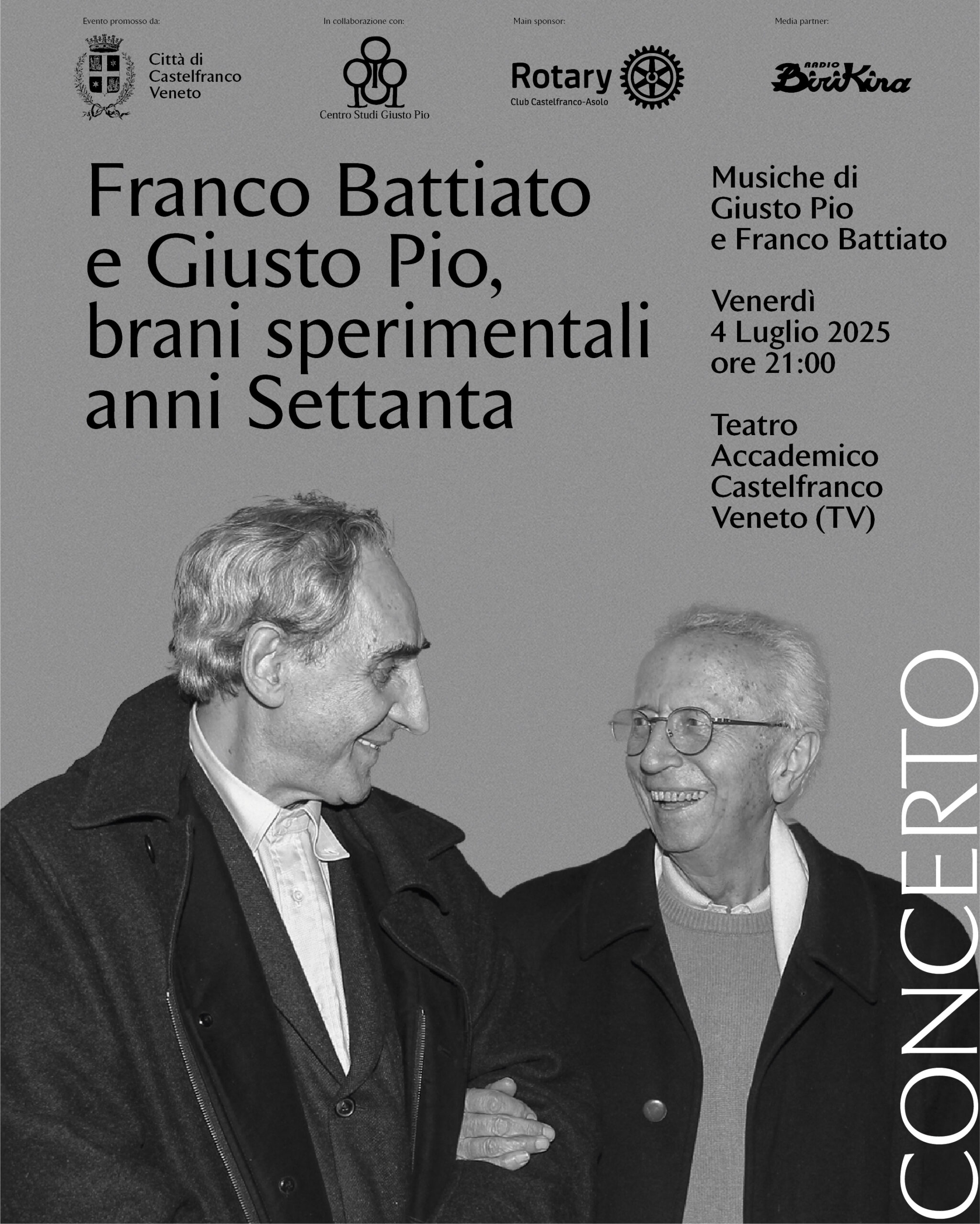 In occasione della mostra “Sulle orme di Giusto Pio e Franco Battiato”, dedicata al sodalizio Pio e Battiato, che sarà ospitata dal 29 giugno al 30 agosto 2025 nella Galleria del Teatro Accademico.